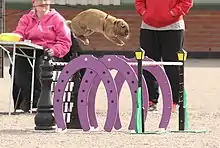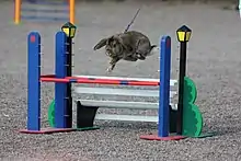 Rabbit show jumping (Swedish: Kaninhoppning[1]), also known as rabbit agility[2] or rabbit hopping,[3] is an animal sport where the animals are led through a course by their owners,[4] modelled after horse show jumping.[5][6] It is typically conducted in a closed, indoor arena, with obstacles scaled to suit the rabbits. Competitions have been held in the United States[3] and several European countries.[2] As rabbits are common domestic pets, some owners train their pet rabbits for this sport.[2]