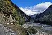 The largest river entirely in Georgia, the Rioni, has its major origins in Racha-Lechkhumi and Kvemo Svaneti, more specifically in Mountain Racha in the Greater Caucasus main ridge northwest of the village of Ghebi at the 3779 meter high Mt Pasismta. The Tskhenistsqali, the sixth river of Georgia, which flows into the Rioni after 176 kilometers at Samtredia, also finds its origin in this region, like the Rioni at Mt Pasismta. Both rivers flow in opposite directions through the region and find their exit in the southwest corner through the Khvamli chalk massif.