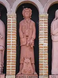 The Rachel Carson sculpture in Woods Hole, Massachusetts was unveiled on July 14, 2013.[119] Google created a Google Doodle for Carson's 107th birthday on May 27, 2014.[120] Carson was featured during the "HerStory" video tribute to notable women on U2's tour in 2017 for the 30th anniversary of The Joshua Tree during a performance of "Ultraviolet (Light My Way)"[121] from the band's 1991 album Achtung Baby.