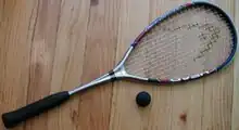 A racket or racquet[1] is a sporting equipment used to strike a ball or shuttlecock back-and-forth in games such as tennis, badminton, squash, racquetball and padel. The typical basic structure of a racket consists of a widened distal end known as the head (which presents a flattened firm surface designed to strike the ball or shuttlecock, known as the face), an elongated (and often cushioned) handle known as the grip, and an reinforced connection between the head and handle known as the throat or heart.