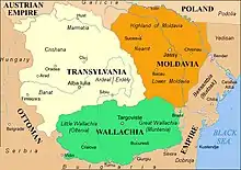 - ↑ Radu's full claimed titles were "Duke of Wallachia, Moldavia and Bessarabia, despot of the Peloponnese, prince of Thessaly, Macedonia and the Holy Roman Empire, of both empires, Count of Epidaurus, Corinth and apostolic count of the Kingdom of Hungary, marquis of Ilfov, Romanați, Teleorman, Suceava, dynast in Galați, Ialomița, Prahova and Dâmbovița, and lord of Oltenia and the Mehedinți Mountains, hospodar of Hotin and Giurgiu, as well as the mines of Telegei, on either side of the Danube, baron of Moghilău, Zănoaga, Afumați, of the two Filipești and of the other territories, fiefs, places and dominions of the serene House of the Cantacuzins in Ukraine and Transylvania".[18]