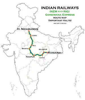 The 12409 / 12410 Raigarh–Hazrat Nizamuddin Gondwana Express is a Superfast Express train belonging to Indian Railways that runs between Raigarh and Hazrat Nizamuddin in India. It is a 5-day service. It operates as train number 12409 from Raigarh to Hazrat Nizamuddin and as train number 12410 in the reverse direction.>