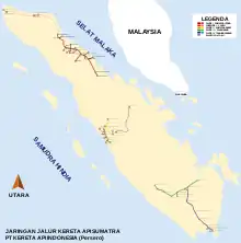 As of 2013, there are 1,869 kilometres of track in Sumatra, of which 1,348 km are operational.[14] Several unconnected railway networks were built in the time of the Dutch East Indies: