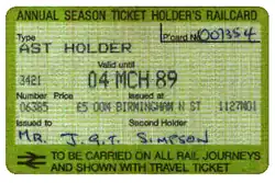 Between 12 May 1985 and 8 October 1988, holders of Annual Season Tickets could buy an Annual Season Ticket Holder's Railcard which gave a 50% discount on Cheap Day Return fares and 34% off Saver tickets for journeys throughout the British Rail network. Discounted tickets were issued with the status code AST-H. Up to four children could travel with the Railcard holder for £1.00 each; their tickets were printed with status code CHAST. Discounted Cheap Day Returns could not be bought on Fridays.