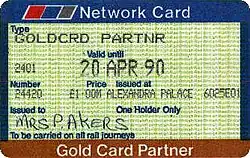 A card giving the same benefits, usually known as the Partner's Card but officially named Gold Card Partner's Network Card, is also available. Initially, Gold Card holders could have a free Network Card issued to them on behalf of a friend, relative or partner; but from 8 January 1989, the new Partner's Card (on dedicated APTIS ticket stock, form number BR 4599/69) was issued instead, at a cost of £1.00. A relative or friend of the Gold Card holder could be nominated, and the Partner's Card could be used independently of the Gold Card—the two cardholders did not have to travel together. The First Class Supplement benefit was withdrawn from Partner's Cards at the same time as from Network Railcards.[38] The card issued to the partner was later made once again a Network Railcard costing £1 and subject to the substantial minimum fare rule. This arrangement was eventually abolished in 2016; Gold Card holders may now purchase a 16–25 Railcard, Two Together Railcard, Disabled Person's Railcard, Senior Railcard, Network Railcard, or Family & Friends Railcard for themselves or anyone else for £10 by presenting the relevant application form and the Gold Card or Gold Record Card at a station in the Gold Card area.[36]