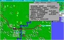 There are four types of stations: Signal Tower, Depot, Station and Terminal. The Signal Tower acts as a passing loop and may control movements. The rest service surrounding areas, with Depots serving the smallest area and Terminals the largest. The player can build at most 32 stations. When the player builds the first station they also build their first engine shop. Trains can only be built at engine shops. The player can upgrade and downgrade Depots, Stations and Terminals as necessaries, and can add other facilities such as stores and hotels.