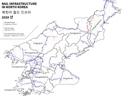 - Hongŭi Line: Hongŭi (km 285.6 Hambuk Line) – Tumangang (→ Khasan, Russia), 9.5 km (5.9 mi), dual gauge standard (1,435 mm (4 ft 8+1⁄2 in)) and Russian (1,520 mm (4 ft 11+27⁄32 in))