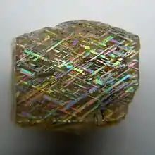 Specimens of potassium feldspar that display a phenomenon remarkably similar to Rainbow lattice sunstone have been found in the area of Statesville, North Carolina.[4] This material contains brown and black exsolution platelets of hematite and ilmenite that show thin-film interference colors along the interface with the host feldspar. Its base colors include blue-gray, tan, and pink. Fine hematite inclusions are apparently responsible for the pink color. Very few of these potassium feldspar crystals are suitable as a gemstone because they are typically quite brittle and tend to break along cleavage during cutting. The source rock of this material is a biotite gneiss.[5]