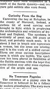 The figure was found during turf cutting in a small peat bog close to the townland boundary between Ralaghan and Crossmakeelan, in the civil parish of Shercock, County Cavan, Ireland.[4] Its discovery was announced in 1930 in the journal Antiquity by Adolf Mahr, keeper of Irish Antiquities in the National Museum in Dublin. Mahr reported that the figure was found face down "under 3 to 4 feet of peat' in an area of bog that had been "reclaimed since".[5] No associated archaeological structures were reported, and Mahr reported that no other finds were retrieved from the bog.