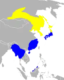 The species is mainly migratory, wintering in southern Japan, eastern China and northern Borneo. It is uncommon in northern parts of Bangladesh,[6] Burma, Laos,[11] and northern and central Thailand,[12][13] and does not normally reach further south in mainland southeast Asia.[11] Migrants have been recorded on Sri Lanka in the past, although on the Indian mainland they are found mainly in the northern regions, with a few records from as far south as Mumbai.[14][15] On arrival in India, rails may be so exhausted that they can be caught by hand.[5] The breeding birds on the Japanese island of Hokkaido mostly migrate well south including to Korea but a few remain during winter in the coastal marshes of Honshu.[16][17]