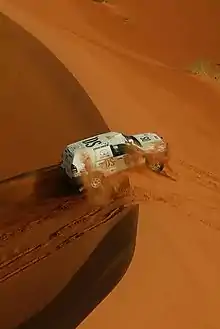 The Rally consists of one prologue and six legs, all entirely off-road, two of which are marathon legs lasting two days. A total of 2,500 kilometers through dried-out river beds, shock absorber-busting stony plains and the sandy dunes of the western Sahara desert have to be covered by the teams with only a compass and a 1:100,000 scale map to plot their route between checkpoints. GPS, and any kind of binoculars and cell phones are forbidden items. The winner is not the fastest team but the one which has traveled the fewest kilometers on the onboard odometer between checkpoints within a given time frame (distance driven minus straight-line distance). Penalty kilometers are allocated for missed checkpoints and requests for technical assistance. For safety reasons, the teams are constantly monitored by a satellite tracking system.