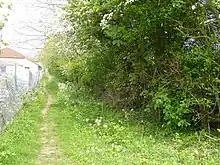 The South Wales Main Line was re-routed following the opening of the Severn Tunnel in 1886. The new route was established in 1903 with the building of what is often known as the Badminton Line.[8] This involved the construction of about 33 miles of new track, part of which skirted Ram Hill and Coalpit Heath. The Great Western Railway purchased the land at the Ram Hill Colliery site in 1898 and a deep railway cutting was created immediately north of the former mine.[9] To the west the Coalpit Heath Railway Station was opened and goods yard sidings established. The station fell victim to Dr Beeching's cuts and was closed in the 1960s.
