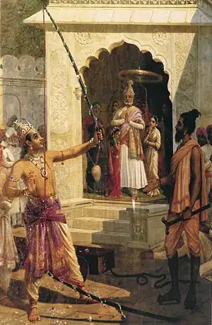 In the meanwhile, King Janaka arranges a swayamvara ceremony for his daughter Sita. A swayamvara ceremony is a Vedic ritual in which a prospective bride selects her groom from among a group of suitors who attend the ceremony. Sita falls in love with Rama at first sight in Janaka's garden and prays to Parvati that she may get Rama as her husband. King Janaka sends a messenger to invite Rama, Laksman and Sage Vishvamitra to attend the swayamvara. Janaka puts a condition to identify the right groom for Sita. The great bow of Shiva by the name of Pinaka was kept in the arena. Any suitor who would be able to string Pinaka would be married to Sita. Many princes try but fail to even nudge the mammoth bow. This causes great distress to Janaka who wonders aloud if the earth has become devoid of brave men. This statement of Janaka angers Lakshman who retorts that no one talks in this vein, when a gathering like this, has the presence of scions of the Sun Dynasty. Rama gently nudges him to keep calm as Vishwamitra asks him to break the bow and make Janaka happy once again. Rama steps in and effortlessly lifts and strings the divine bow. In a swift move, he breaks the bow. The breaking of Pinaka causes a great noise that disturbs the great sage Parashurama in his meditation and he storms into the swayamvara arena in great anger vowing to kill whoever had dared to break the bow of lord Shiva. Lakshman enters into an argument with Parashurama, paying scant respect to the sage who was known for his bursts of anger and was known to slay whoever dared to oppose him. Ultimately, Rama brings him around. Parashurama discovers the real nature of Lord Rama as the ultimate Brahman, pays his respects and leaves for the forests for meditation. Sita places the wreath of victory around the neck of Rama in accordance with the rules of the swayamvara and is thus wedded to him.
