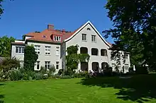 - The two-and-a-half-storey accountant's villa was built in 1829 in yellow plaster. The gable end is clad in chamfered paneling with sawtooth frieze, which, like the building's joinery, is painted brown. The windows, on the other hand, are painted white and are of the central mullion type with glazing bars, where those in the gable ends have white painted coverings. At the main entrance, on the north long side, the villa has an extended porch with an overhanging balcony with glazed sides, which in turn is covered by a small projected gabled roof. Above the balcony is a smaller paneled frontispiece, which has a similar counterpart on the opposite side of the house.[68]