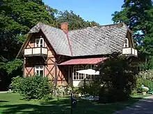 - Villa Desideria was built in 1801 for the Trolle family. It is a one-and-a-half-storey timber-frame house with brown painted oak and yellow brick in the bays. The building's long side façades have frontispieces to the north and south, while the gables have secondary porches to the east and west, added in 1899. The main entrance faces south and is located under a carved porch added between 1873 and 1879. The carpentry details are painted brown, except for the veranda balustrade and the windows and linings of the porch, which are painted white. The villa takes its name from Queen Desideria, the wife of Charles XIV John, who stayed in the villa during her stays at the spa. Previously, the house was called the Old Trolle House.[69]