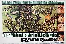 Rampage is a 1963 American adventure film directed by Phil Karlson and starring Robert Mitchum, Jack Hawkins and Elsa Martinelli. It features a musical score by Elmer Bernstein and was based on the eponymous novel by Alan Caillou, published in 1961.