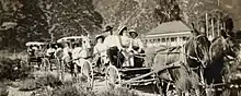 Following the 1855 Public Land Commission ruling, squatters began settling in the Temescal Valley to establish title to land there under the Preemption Act of 1841. In 1857, the Temescal Station of the Butterfield Overland Mail stage line was established five miles north of the Temescal Hot Springs, ten miles north of Rancho La Laguna station and twenty miles south of the Chino Rancho station. The Temescal Overland station was "at the foot of the Temescal hills, a splendid place to camp, wood and water plenty, and protected from the winds."[11] Temescal had its own post office from Feb 12, 1861 to Nov 12, 1861.[12] Around this location the settlement of Temescal grew over the next few decades. By 1860, Greenwade's Place at Temescal, 3 miles north of the stage station, was a polling place for southwestern San Bernardino County. Voting irregularities there that year, resulted in a court case between the candidates for a California State Assembly seat. The trial was so contentious it included the shooting of Bethel Coopwood, one of the opposing lawyers by the other in court, before the results could be determined.
