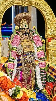 The main shrine for Ranganatha is in the innermost courtyard. The sanctum has a golden vimanam (crown tower over the sanctum sanctorum). It is shaped like the Tamil omkara (om symbol), shows anthropomorphic Paravasudeva on its gable, has an etching of Ramanuja as well on it, and is plated with gold. Inside, a 6-metre (20 ft) edifice of Ranganatha reclining on Adisesha, the coiled serpent, can be seen.[67][note 4] Adisesha has five hoods and is coiled into three and a half rounds. Vishnu's head rests on a small cylindrical pillow and his right palm which faces upwards rests next to his head. A pendant containing Lakshmi's image is placed on Ranganatha's chest. Ranganatha's crown, hands and feet are plated with gold. Neither Sridevi (goddess Lakshmi) nor Bhudevi (goddess Earth) are depicted near his feet, as is found in late medieval era paintings. The sanctum does not show Brahma coming out of or connected to his navel either.[69][70] However, the procession images of Sridevi, Bhudevi and Ranganathar, otherwise known as Azhagiyamanavalan and Namperumal reside within the sanctum in different places to ease their darshana (viewing).[71] Another brass idol of Vishnu is seen at the feet of the main stone idol. This idol was the makeshift idol used during the Muslim invasion when the original idol was stolen. Both the original and the makeshift idols are worshipped and brought out in processions in a grand manner during the Serthi Seva and Tirumanjanam ceremonies. The only source of illumination is from two ghee lamps, one hanging from the ceiling and another placed on the ground, both positioned near the feet of Ranganatha.