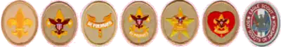 The advancement program for Scouts participating in the Scouts BSA program of the Boy Scouts of America is symbolized by the earning of seven ranks. The advancement program is often considered to be divided into two phases. The first phase from joining to First Class is designed to teach the scout Scoutcraft skills, how to participate in a group and to learn self-reliance. The Scout badge is awarded when the Scout demonstrates a rudimentary knowledge of the Scouting ideals and program.[1] Tenderfoot,[2] Second Class,[3] and First Class[4] have progressively harder requirements in the areas of Scoutcraft, physical fitness, citizenship, personal growth and Scout Spirit.