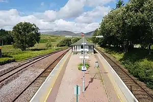 Rannoch railway station, on the West Highland Line, serves the area of Rannoch in Perth and Kinross, Scotland. In 2017, Simon Jenkins reported it to be one of the best 10 stations in Britain.[4] It is situated between Corrour and Bridge of Orchy, 64 miles 36 chains (103.7 km) from Craigendoran Junction, near Helensburgh.[5] ScotRail manage the station and operate most services, along with Caledonian Sleeper.