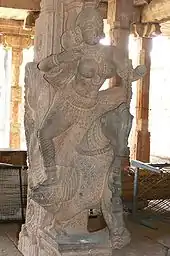 A stone Rati sculpture on a temple pillar, opposite the pillar with Kama. Seated on a parrot, Rati is holding a sugarcane bow.