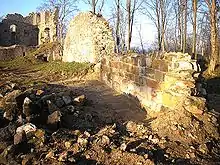 Of note are the ruins of the old late Gothic chapel, which projects bastion-like into the neck ditch. There are still cleaning residues from the original consecration crosses. However, the chapel has been badly affected by the increasing vandalism of the ruins. In early 2005, part of the beautiful external cornice (Kaffgesims) was thrown into the ditch. Some structural damage resulted from a failed attempt by a youth group to renovate the top of the wall in the late 20th century. Around 1980, a human skeleton was unearthed in the chapel during an illegal excavation, suggesting that a tomb or crypt lay under the chapel.