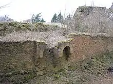 To the right rise the ruins of palas (13th to 16th century) which have been secured by emergency work. The huge Renaissance window of the upper floor poses serious historic preservation problems. One of the windows was underpinned by a steel frame. Of interesting is a small fireplace in the tiny room next to the bridge. It may well have been the gatekeeper's room. Of the other internal buildings only remains of walls and vaults have survived.