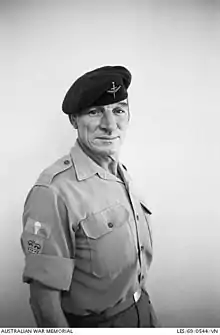 Simpson joined the Second Australian Imperial Force on 15 March 1944 and was posted to the 41st/2nd Battalion, a militia battalion that served as a holding unit for soldiers under 19 years of age. With this battalion, he was posted to Cowra as part of the prisoner of war camp garrison which had been reinforced after the Cowra breakout on 5 August 1944. He was subsequently posted to the 2/3rd Pioneer Battalion, while subsequent postings included the Advanced Ordnance Depot and the 26th Battalion.[2] During this time he served in Morotai, Tarakan and Rabaul.[1]