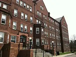 Designed by architect Francis R. Allen, Raymond House is the second of Vassar's five quadrangle dormitories.[4] The red brick dormitory has five floors above ground, as well as a basement. There are two main entrances to the building, one on the east to the quadrangle, and one on the west to the road.[4] The building's name, Raymond House, is inscribed over the dormitory's entrance.[5] The staircase to the west entrance was entirely rebuilt in 2005.[4] The roof of Raymond is made of green slate, and the building contains six chimneys; each with two wythes, or internal flues, of brick and with bluestone caps.[4]