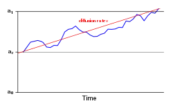 The drift-diffusion model (DDM) is a well-defined mathematical formulation to explain observed variance in response times and accuracy across trials in a (typically two-choice) reaction time task.[41] This model and its variants account for these distributional features by partitioning a reaction time trial into a non-decision residual stage and a stochastic "diffusion" stage, where the actual response decision is generated. The distribution of reaction times across trials is determined by the rate at which evidence accumulates in neurons with an underlying "random walk" component. The drift rate (v) is the average rate at which this evidence accumulates in the presence of this random noise. The decision threshold (a) represents the width of the decision boundary, or the amount of evidence needed before a response is made. The trial terminates when the accumulating evidence reaches either the correct or the incorrect boundary.[42]