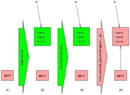 The first state shows a global pointer named gptr that is initially NULL, colored red to indicate that it might be accessed by a reader at any time, thus requiring updaters to take care. Allocating memory for a new structure transitions to the second state. This structure has indeterminate state (indicated by the question marks) but is inaccessible to readers (indicated by the green color). Because the structure is inaccessible to readers, the updater may carry out any desired operation without fear of disrupting concurrent readers. Initializing this new structure transitions to the third state, which shows the initialized values of the structure's fields. Assigning a reference to this new structure to gptr transitions to the fourth and final state. In this state, the structure is accessible to readers, and is therefore colored red. The rcu_assign_pointer primitive is used to carry out this assignment and ensures that the assignment is atomic in the sense that concurrent readers will either see a NULL pointer or a valid pointer to the new structure, but not some mash-up of the two values. Additional properties of rcu_assign_pointer are described later in this article.