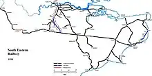 The South Eastern Railway (SER) was a railway company in south-eastern England from 1836 until 1922. The company was formed to construct a route from London to Dover. Branch lines were later opened to Tunbridge Wells, Hastings, Canterbury and other places in Kent. The SER absorbed or leased other railways, some older than itself, including the London and Greenwich Railway and the Canterbury and Whitstable Railway. Most of the company's routes were in Kent, eastern Sussex and the London suburbs, with a long cross-country route from Redhill in Surrey to Reading, Berkshire.