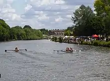 Another hiatus occurred after World War I, but thenceforth the regatta grew from strength to strength requiring various adaptations to accommodate the entry level.[3] This resulted in a review in 1999 which saw two-lane racing reintroduced on a 1500 metres course by changing from launch to bank umpiring. An ironical conclusion perhaps as in 1844 a ferryman had spent four months in Reading Gaol for attacking an umpire and tipping him into the river with a punt pole in retaliation for disqualification in the previous year's regatta.