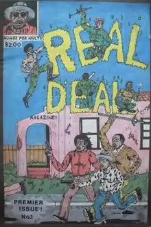 Real Deal Magazine was an independent comic book title published in the 1990s. One of the rare contemporary African-American-created and published comics, Real Deal depicted Los Angeles underworld life with deadpan visceral humor and gross-out violence (termed "Urban Terror" by the creators). Stories were by H.P. McElwee (aka "R.D. Bone") and art primarily by Lawrence Hubbard (aka "Raw Dawg").