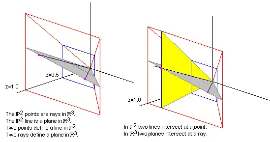 If z = 1 we have a normalized homogeneous coordinate. All points that have z = 1 create a plane. Let's pretend we are looking at that plane (from a position further out along the z axis and looking back towards the origin) and there are two parallel lines drawn on the plane. From where we are standing (given our visual capabilities) we can see only so much of the plane, which we represent as the area outlined in red in the diagram. If we walk away from the plane along the z axis, (still looking backwards towards the origin), we can see more of the plane. In our field of view original points have moved. We can reflect this movement by dividing the homogeneous coordinate by a constant. In the adjacent image we have divided by 2 so the z value now becomes 0.5. If we walk far enough away what we are looking at becomes a point in the distance. As we walk away we see more and more of the parallel lines. The lines will meet at a line at infinity (a line that goes through zero on the plane at z = 0). Lines on the plane when z = 0 are ideal points. The plane at z = 0 is the line at infinity.