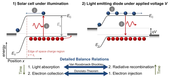 The Donolato theorem is based on the principle of detailed balance and connects the processes of charge carrier injection (relevant in the luminescent mode of operation) and charge carrier extraction (relevant in the photovoltaic mode of operation). In addition, the detailed balance between absorption of photons and radiative recombination can be mathematically expressed using the van Roosbroeck-Shockley[3] equation as
