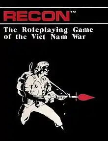 Recon (appearing later as RECON) is a military role-playing game where players assume the role of American soldiers during the Vietnam War. The first edition featured a wargame with role-playing elements, somewhat like Behind Enemy Lines and Twilight 2000, then gradually evolved into a full role-playing game.