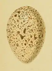 The chough lays three to five eggs 3.9 by 2.8 centimetres (1.5 by 1.1 inches) in size and weighing 15.7 grammes (0.55 oz), of which 6% is shell.[4] They are spotted, not always densely, in various shades of brown and grey on a creamy or slightly tinted ground.[21]