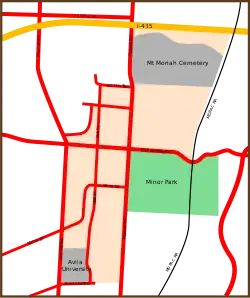 Red Bridge is a neighborhood in South Kansas City, Missouri. It is centered on the intersection of Red Bridge Road and Holmes Road, on the south side of I-435. Avila University, Minor Park, and the Mount Moriah Cemetery are all located within the Red Bridge neighborhood.