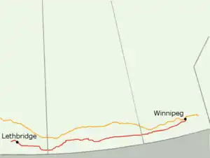 - 1 2 3 Google (January 24, 2018). "Red Coat Trail in AB, SK, and MB" (Map). Google Maps. Google. Retrieved January 24, 2018.