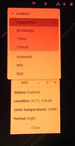 Redshift originally possessed only a command-line interface, but now has graphical user interfaces (GUIs) that support most Linux desktop environments. Those GUIs include redshift-gtk, redshift-plasmoid, and nightshift.