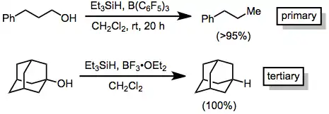Some alcohols are reduced to alkanes when treated with hydrosilanes in the presence of a strong Lewis acid. Brønsted acids may also be used. Tertiary alcohols undergo facile reduction using boron trifluoride etherate as the Lewis acid.[2] Primary alcohols require an excess of the silane, a stronger Lewis acid, and long reaction times.[3]