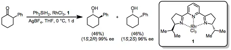 In the presence of rhodium catalyst 1 and rhodium trichloride, 2-phenylcyclohexanone is reduced with no diastereoselectivity but high enantioselectivity.[13]