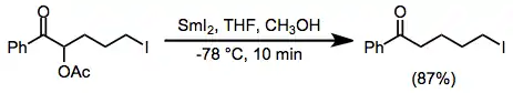α-Functionalized carbonyl compounds are reduced to the corresponding unfunctionalized carbonyl compounds in the presence of samarium(II) iodide. This process may be initiated by initial electron transfer to either the substituent at the α position or the carbonyl moiety, depending on the relative electron affinity of the functional groups. A second reduction immediately follows, after which either protonation or elimination-tautomerization affords the product.[13]
