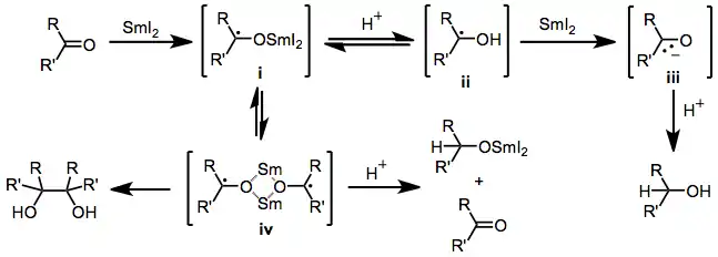 The mechanism of reductions of aldehydes and ketones by samarium(II) iodide is based primarily on mechanisms elucidated for similar one-electron reducing agents.[12] Upon single-electron transfer, a ketyl dimer iv forms. In the absence of protic solvent, this dimer collapses to form 1,2-diols. In the presence of a proton source, however, the dimer may undergo either disproportionation to form a samarium alkoxide and carbonyl compound, or protonation to form a carbinol radical ii followed by a second reduction and protonation, yielding an alcohol.