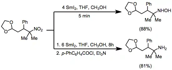 - ↑ Kende, A (1991). "Controlled reduction of nitroalkanes to alkyl hydroxylamines or amines by samarium diiodide". Tetrahedron Letters. 32 (14): 1699–1702. doi:10.1016/S0040-4039(00)74307-3.