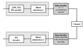Deep-space concatenated coding system.[8] Notation: RS(255, 223) + CC ("constraint length" = 7, code rate = 1/2).