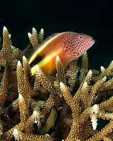 An example of commensalism occurs between the hawkfish and fire coral. Thanks to their large, skinless pectoral fins, hawkfish can perch on fire corals without harm. Fire corals are not true corals, but are hydrozoans possessing stinging cells called nematocysts which would normally prevent close contact. The protection fire corals offer hawkfish means the hawkfish has the high ground of the reef, and can safely survey its surroundings like a hawk. Hawkfish usually stay motionless, but dart out and grab crustaceans and other small invertebrates as they pass by. They are mostly solitary, although some species form pairs and share a head of coral.