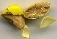 A yellow Reese's Piece cut in half, showing the peanut butter inside