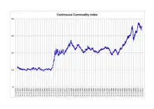 The Refinitiv Equal Weight Commodity Index (formerly known as the Continuous Commodity Index) is a major US barometer of commodity prices. The index comprises 17 commodity futures that are continuously rebalanced: cocoa, coffee, copper, corn, cotton, crude oil, gold, heating oil, live cattle, live hogs, natural gas, orange juice, platinum, silver, soybeans, Sugar No. 11, and wheat.